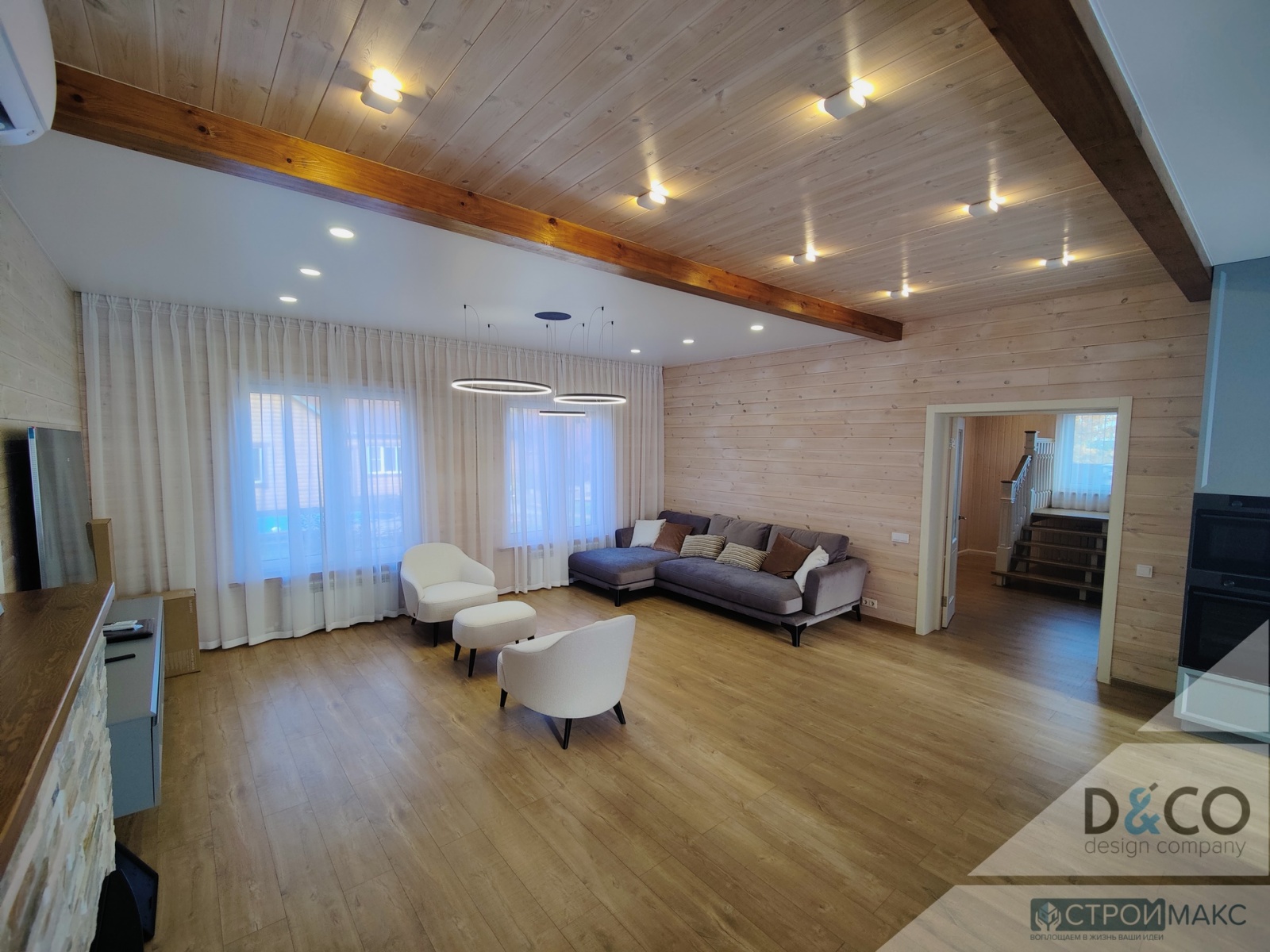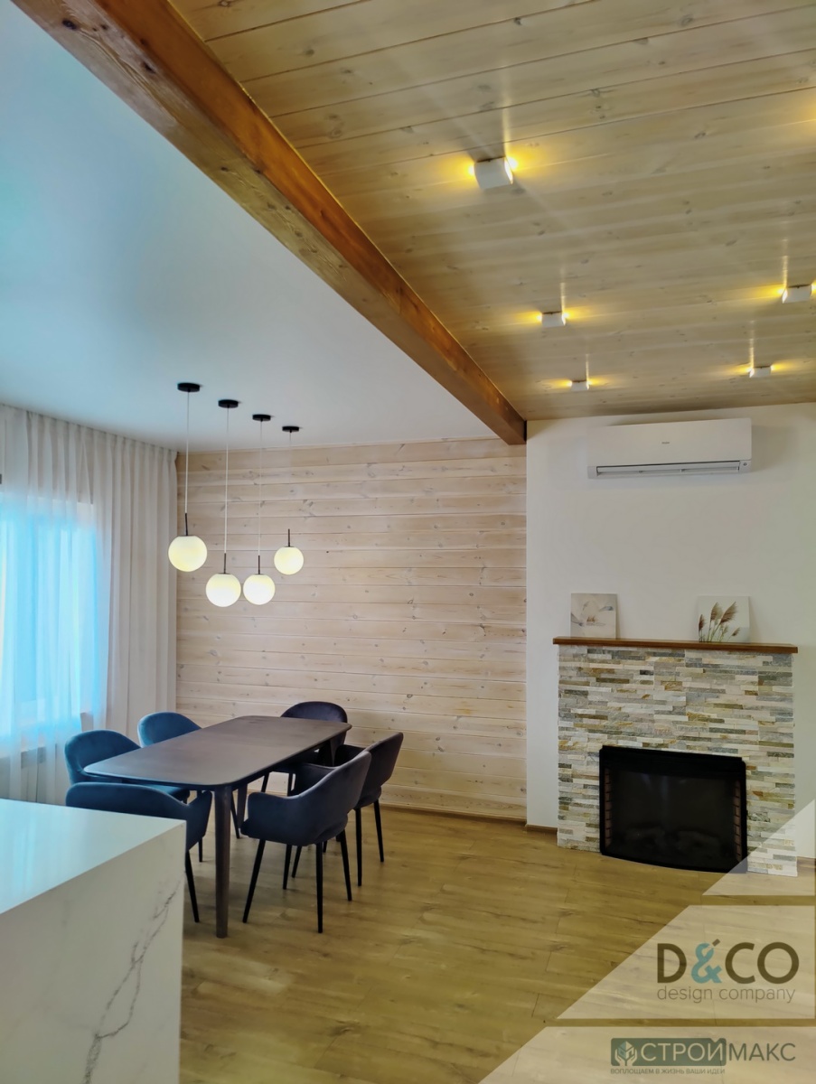 Классический натяжной потолок в коттедже в п.Красный Яр с установкой светодиодного освещения. Особую атмосферу комнате придает комбинация с потолками из настоящего дерева.