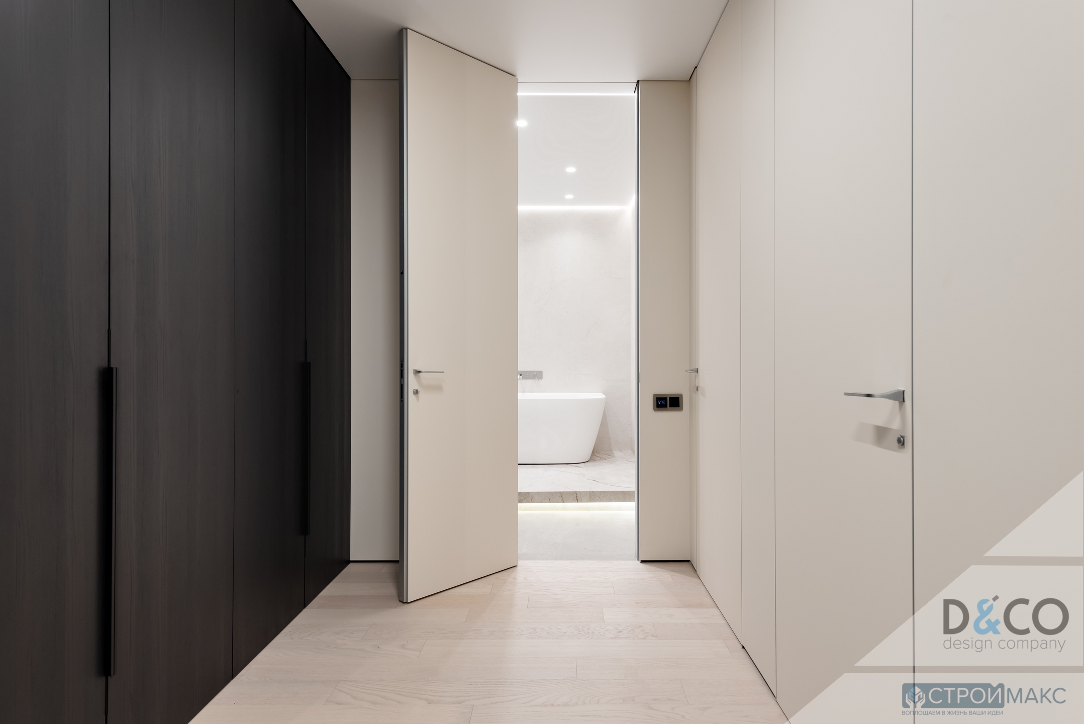 Переход уровня потолкаИнтегрированный карниз LumFerRGB подсветкаНакладной однофазный трекТеневое примыкание по периметру, в том числе и по мебелиСветовой потолок в ванной + однорядный карнизЧёрная ниша для спотов в спальнеПарящий потолок в…