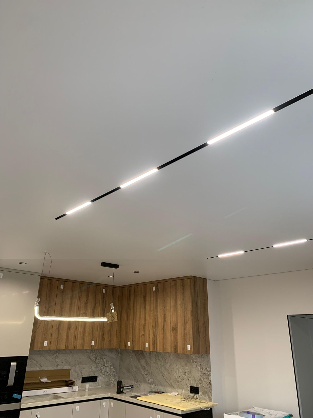 Наполнили потолок безрамными светильниками, магнитными треками, световыми линиями, евронишами и смотрите, как красиво получилось. Про теневой зазор уже и говорить не надо, он идет по умолчанию. Кстати, светильники в треке…