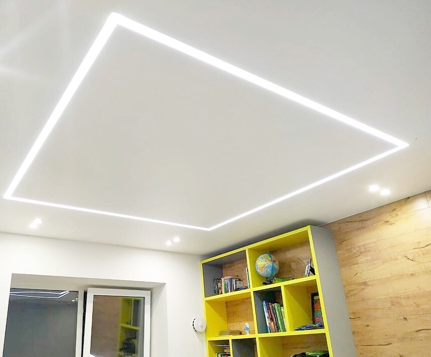 Контурный потолок – это натяжной потолок, по периметру которого располагается светодиодная лента, установленная в специальном алюмингиевом профиле.