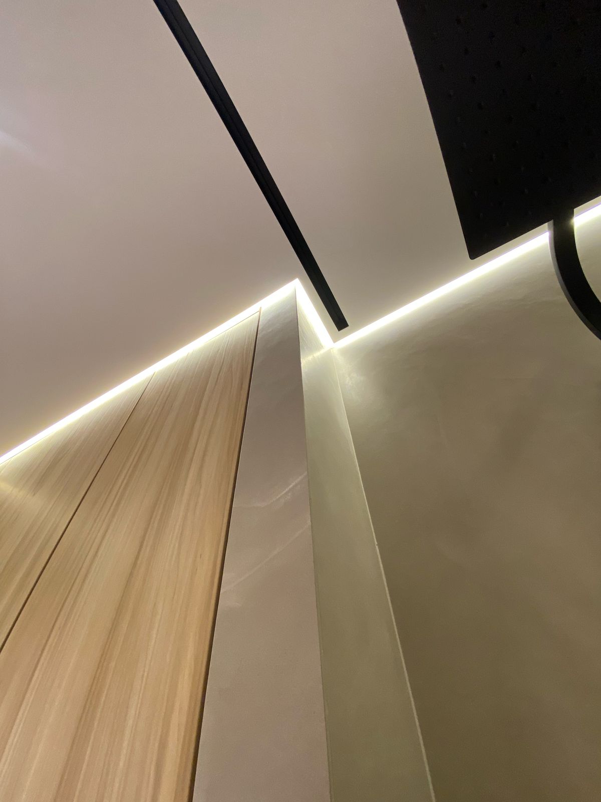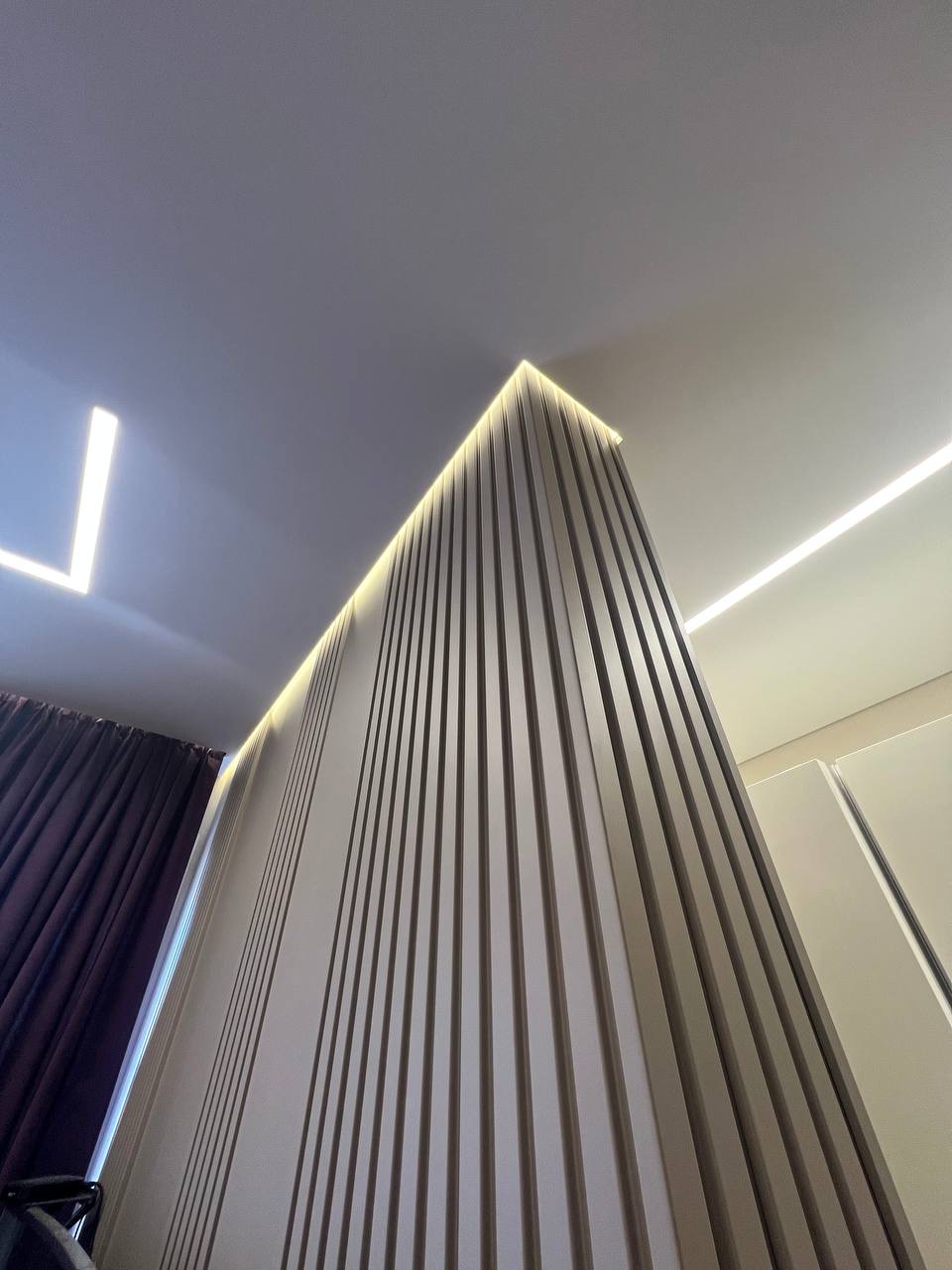 В проектах мы часто комбинируем эти два вида профилей, чтобы подсветить часть стены, панно, рейки либо обойти 3D панели.