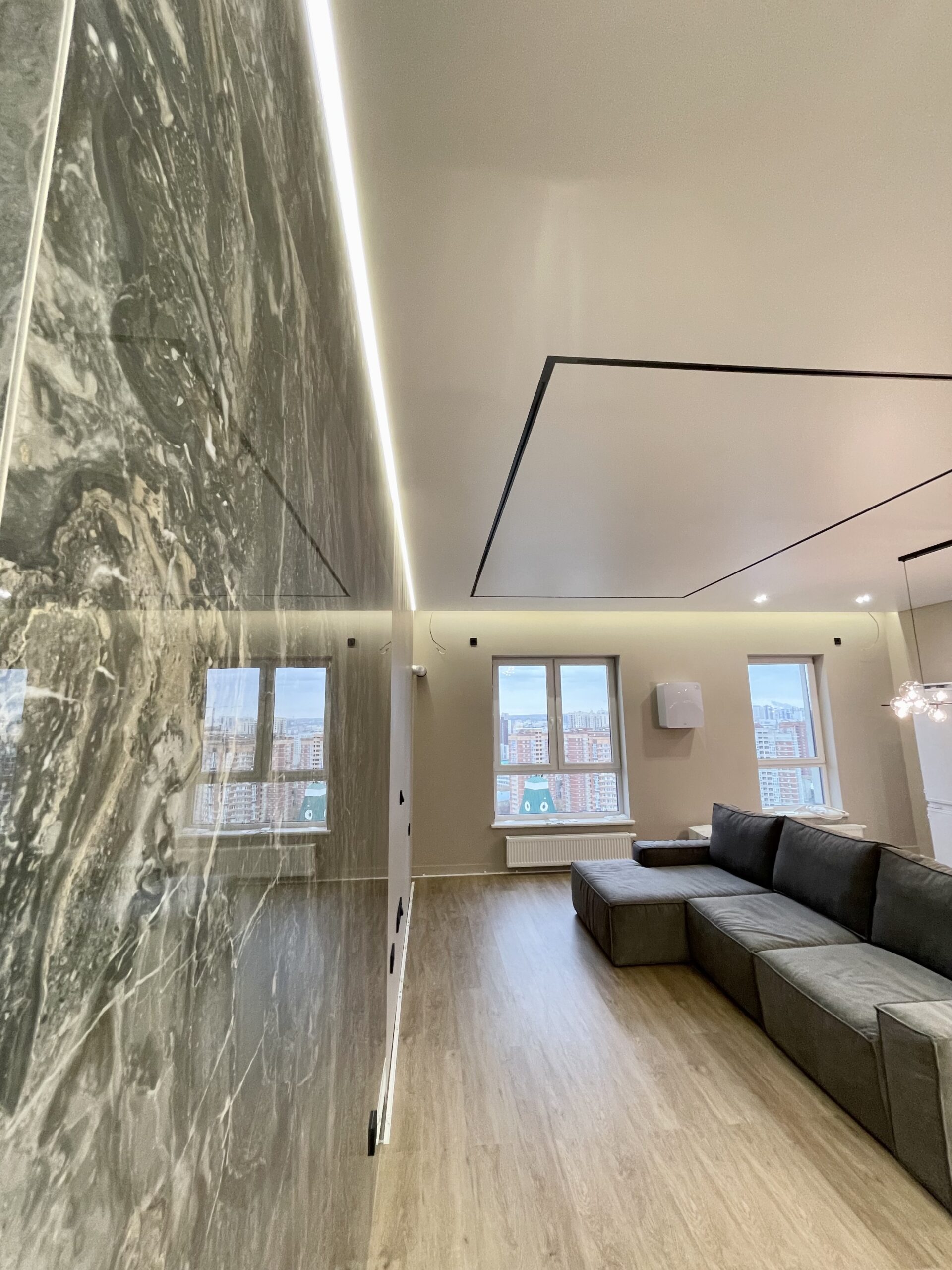 Теневой потолок с подсветкой — он же парящий потолок. Заказчики очень часто путают эти два вида потолка, поэтому давайте еще раз разберёмся.
