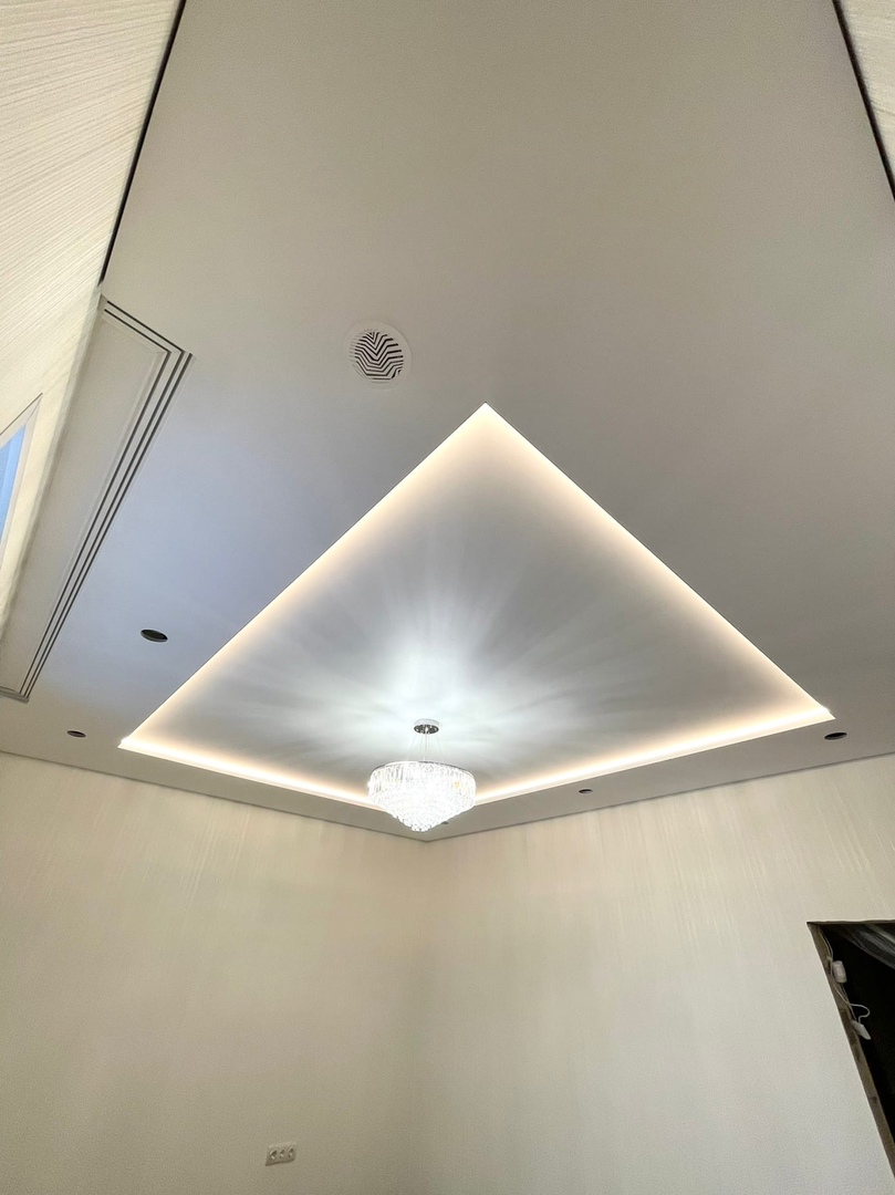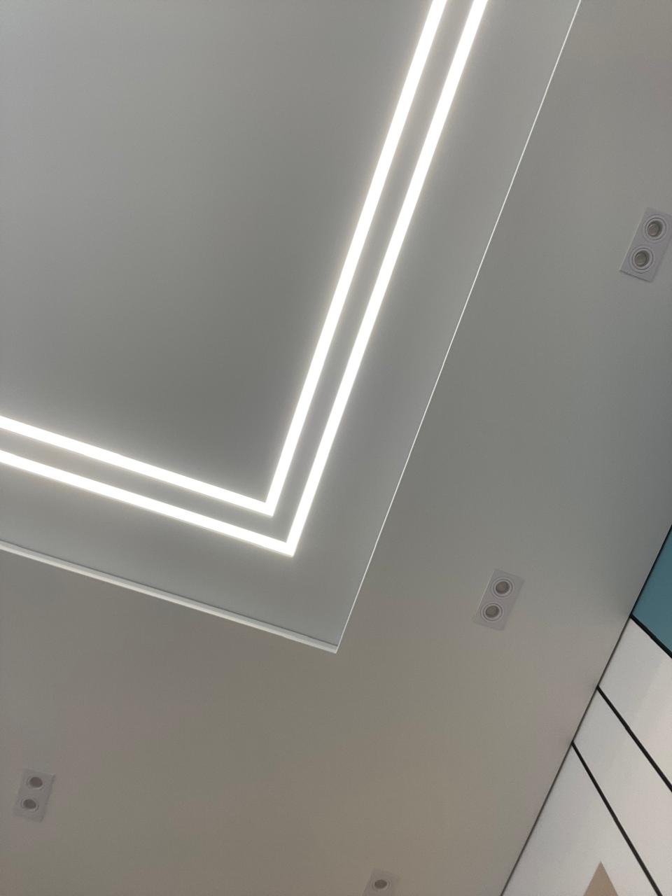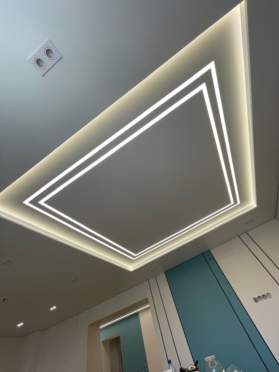 Отдельное внимание заслуживает многоуровневый потолок с подсветкой — он позволяет встроить светодиодные ленты или точечные светильники, создавая эффектную игру света и уюта. Такой потолок становится не только декоративным элементом, но и функциональной частью освещения.
