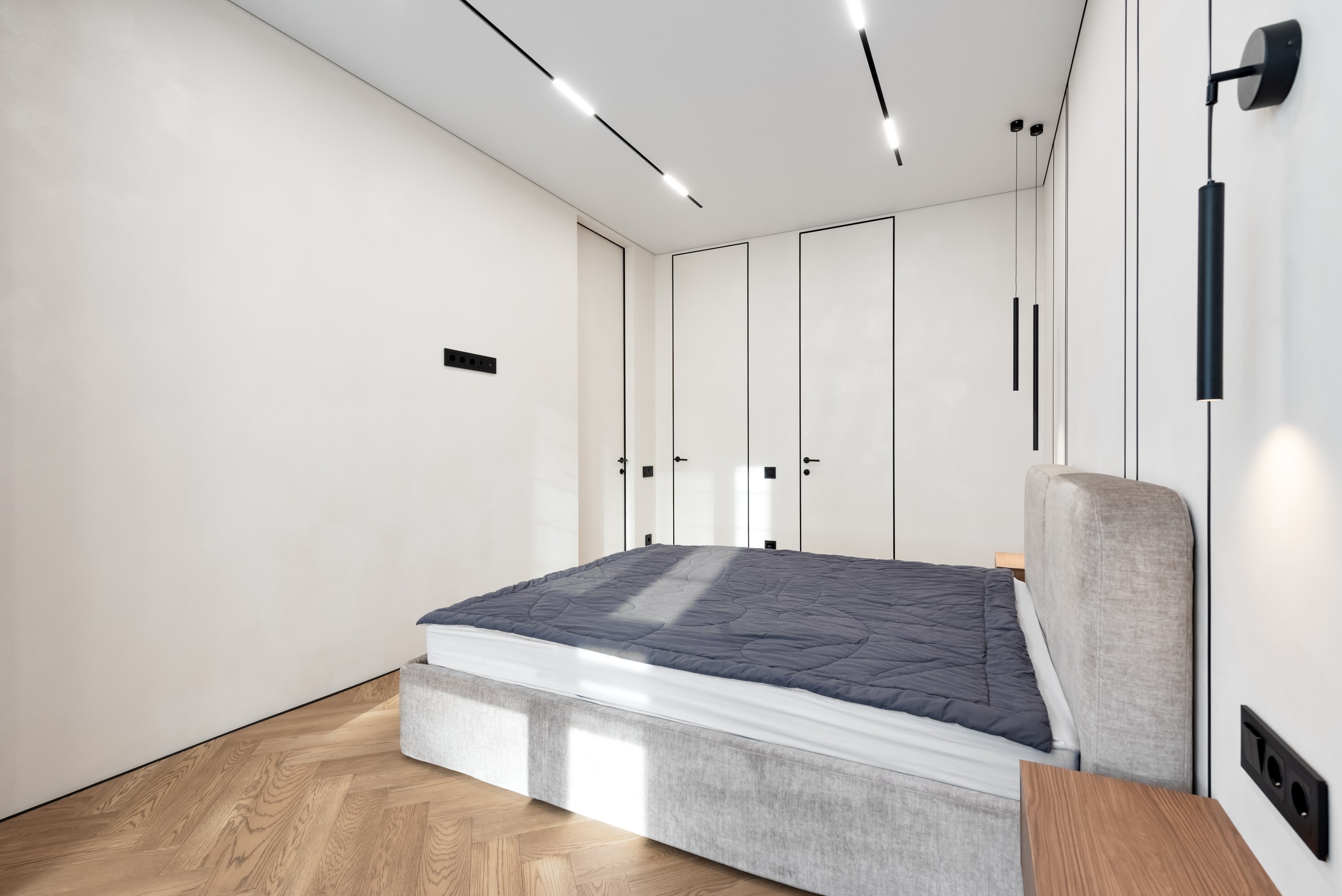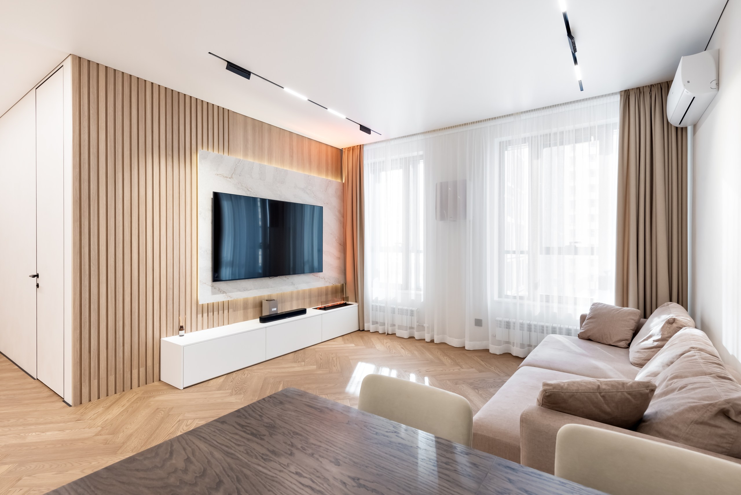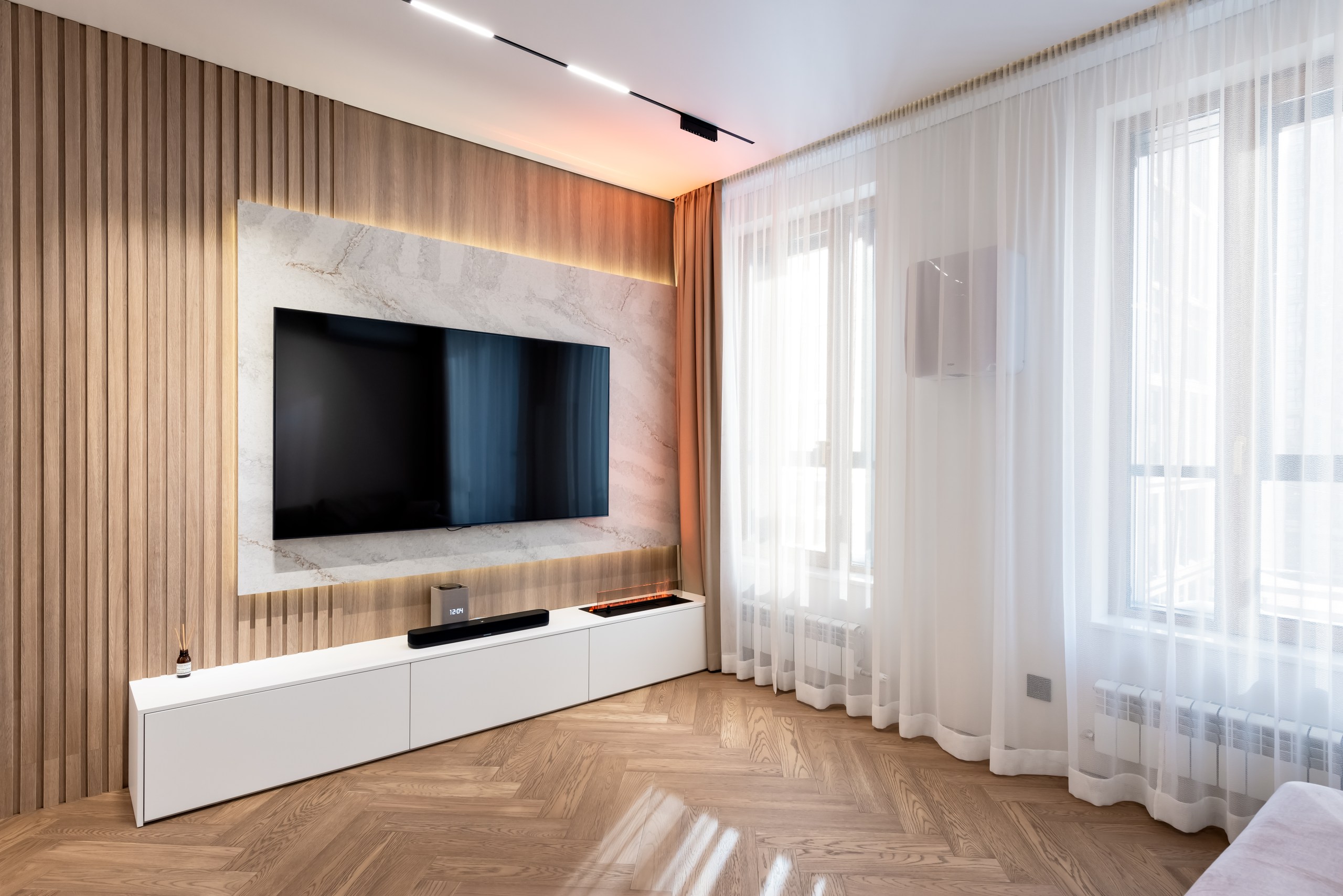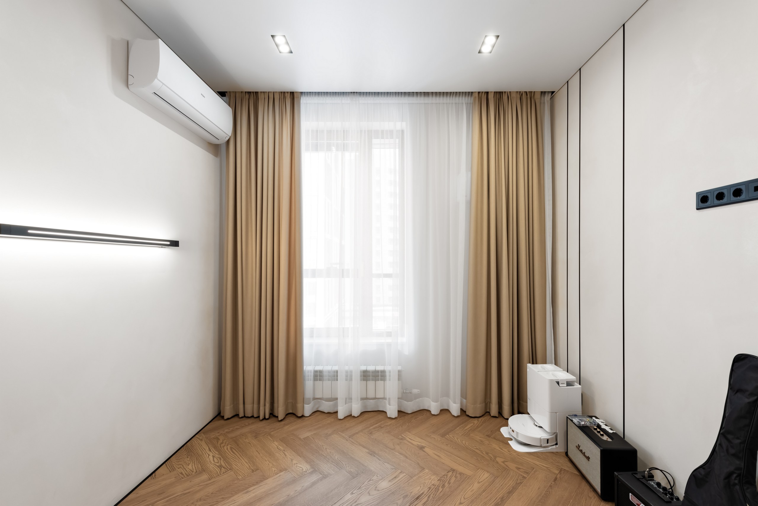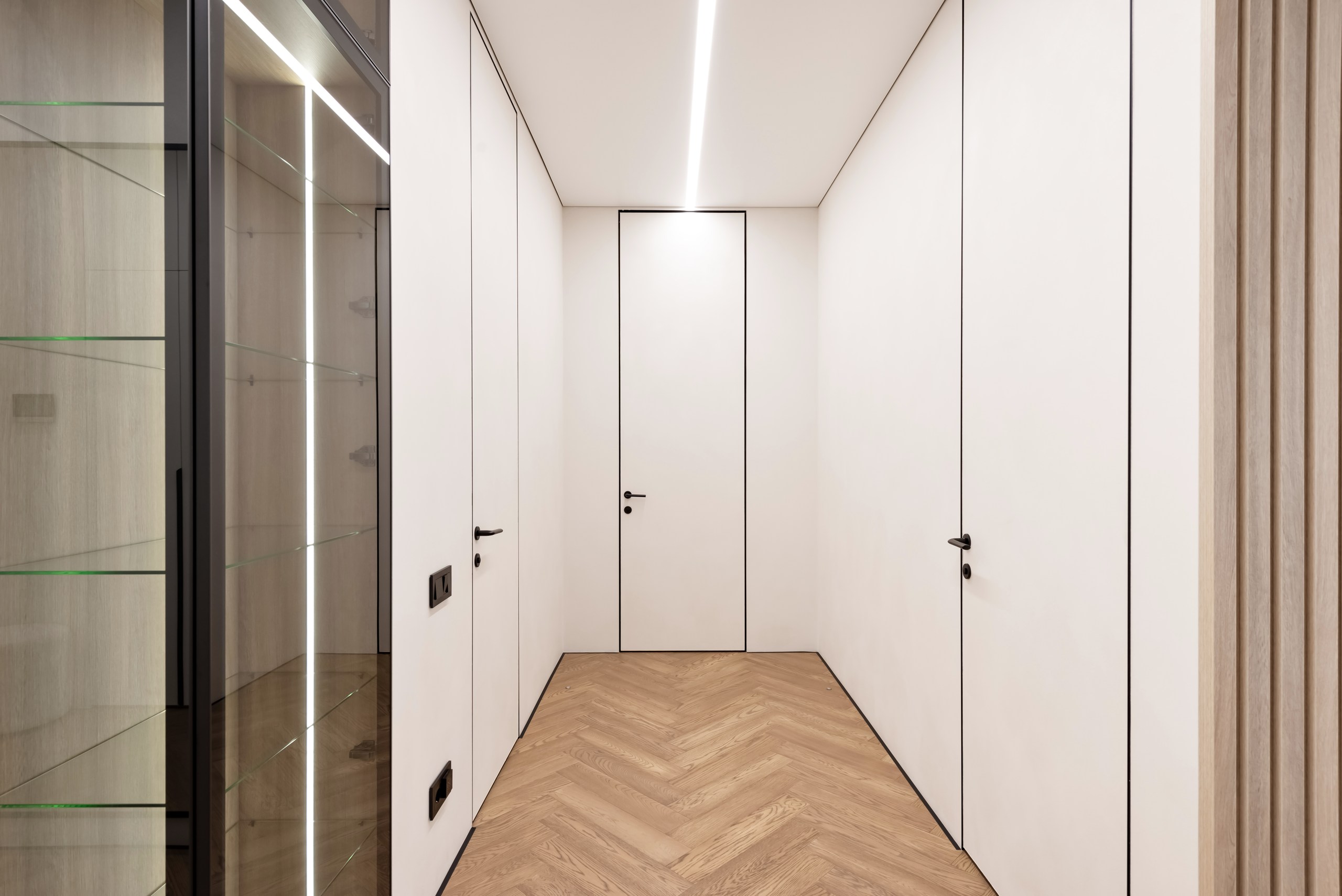Если вы стремитесь к минималистичному и аккуратному результату без использования плинтусов и маскировочных вставок, то теневой натяжной потолок — идеальный выбор. Отсутствие декоративных лент и чёткая теневая линия создают эффект «парящего» потолка.