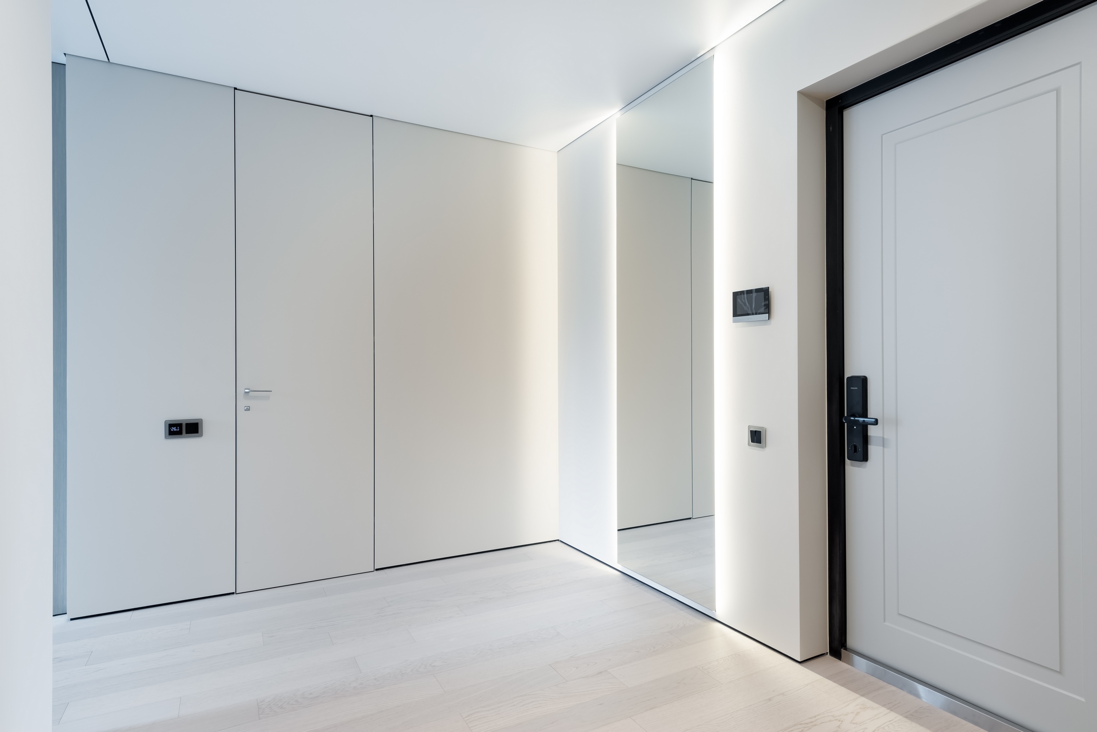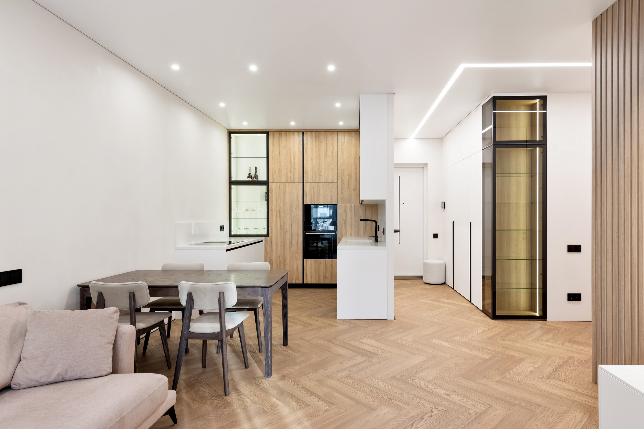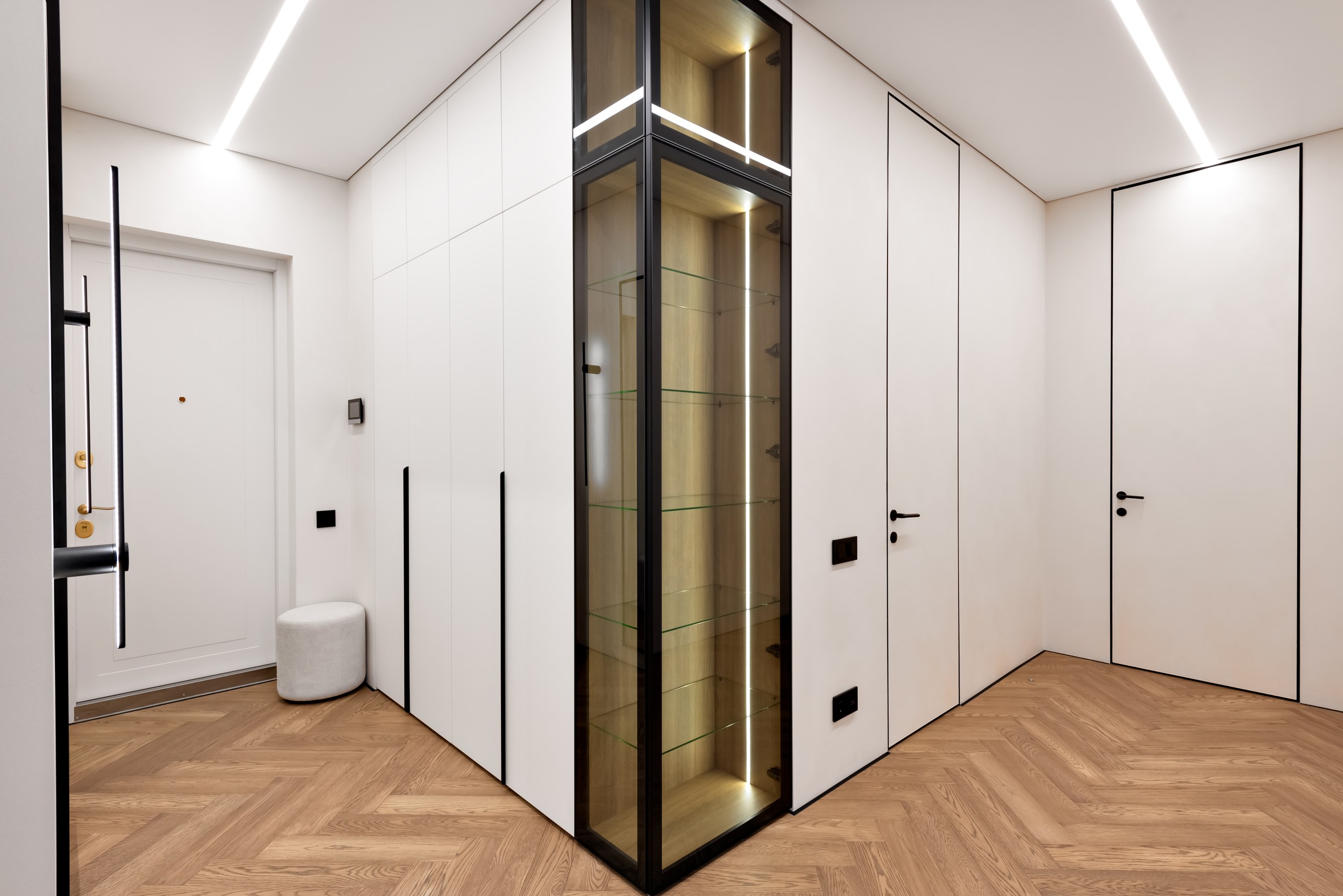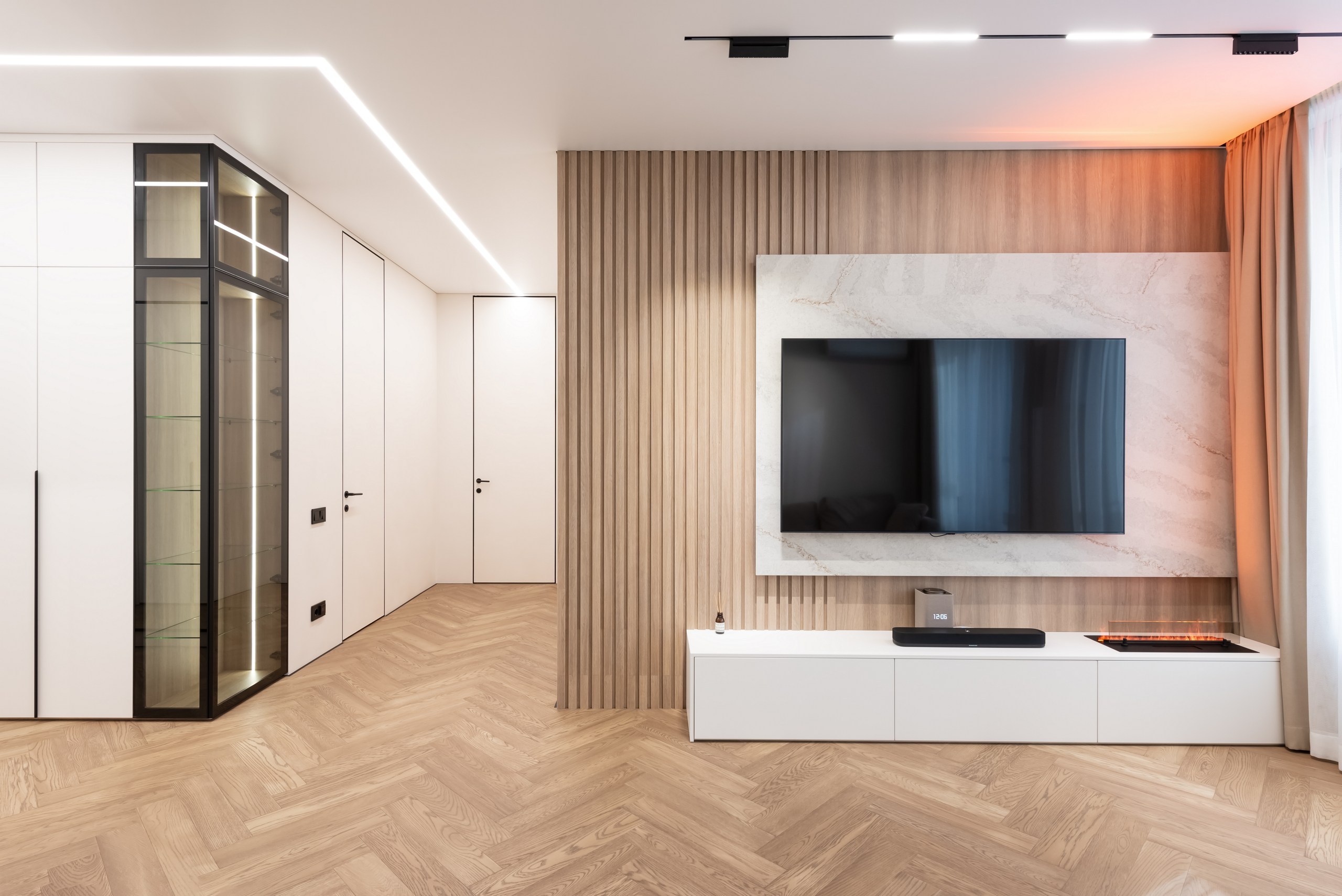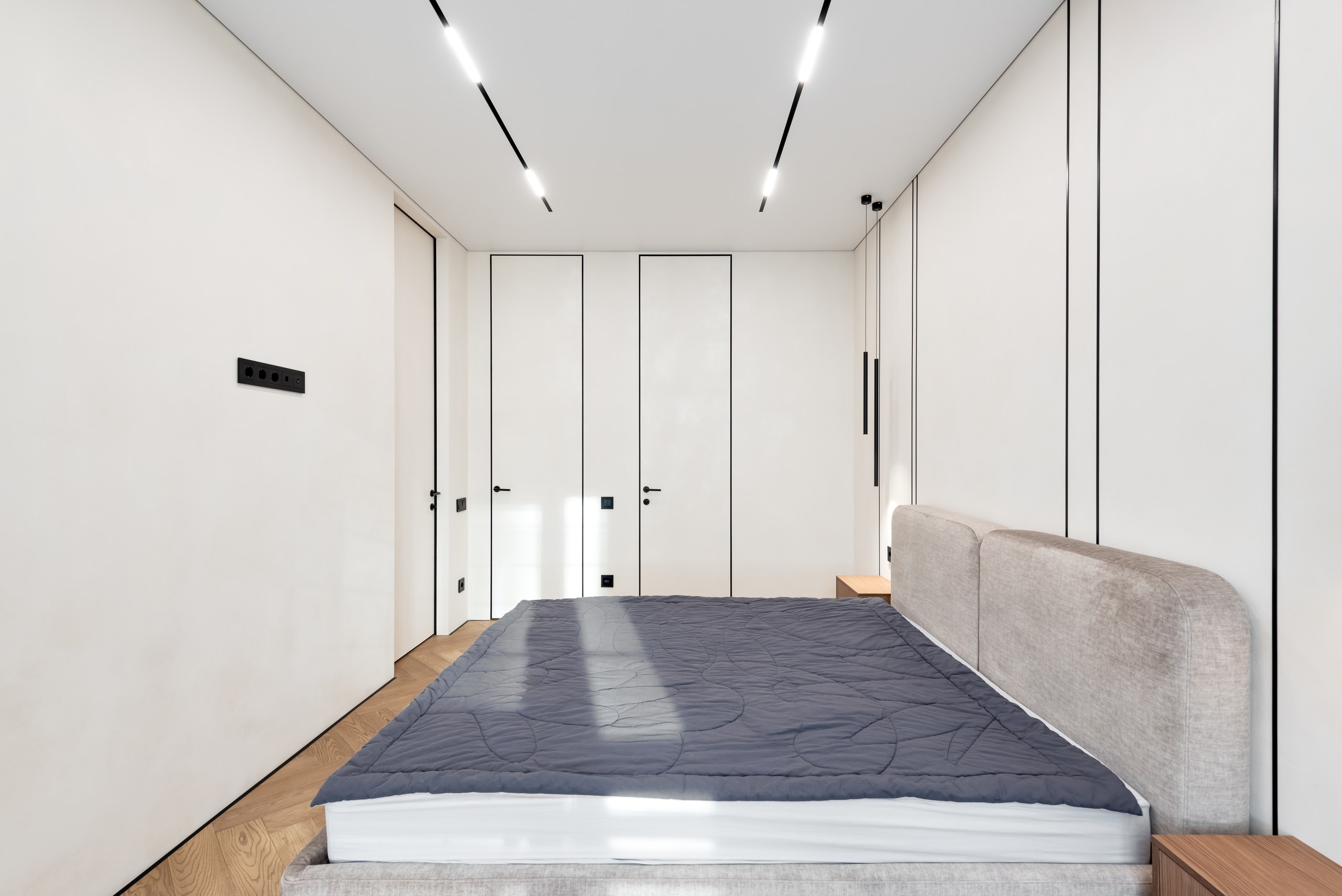 Если вы стремитесь к минималистичному и аккуратному результату без использования плинтусов и маскировочных вставок, то теневой натяжной потолок — идеальный выбор. Отсутствие декоративных лент и чёткая теневая линия создают эффект «парящего» потолка.