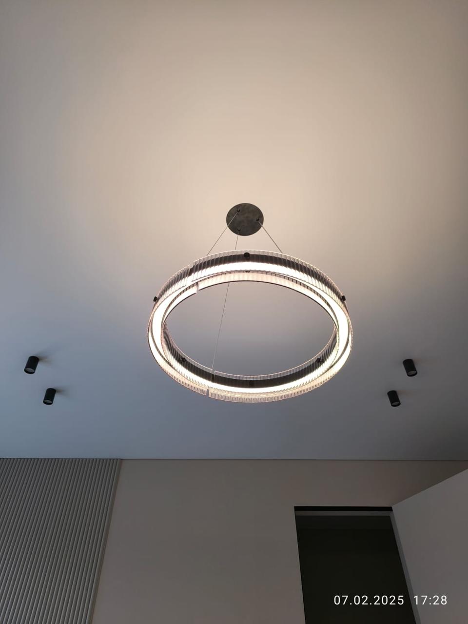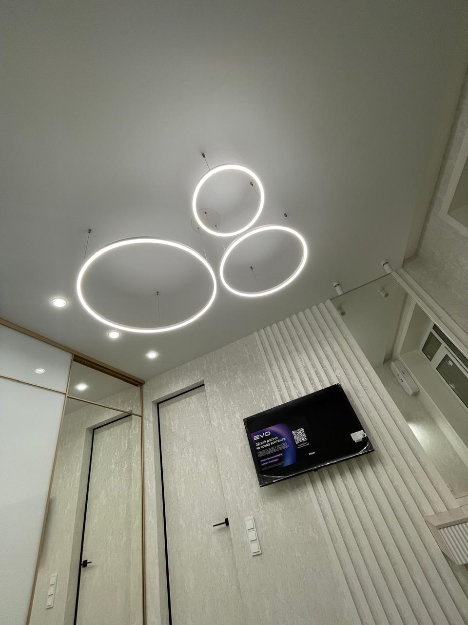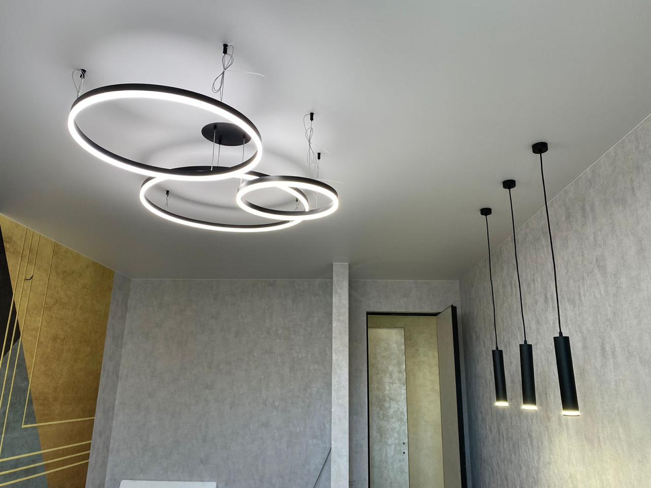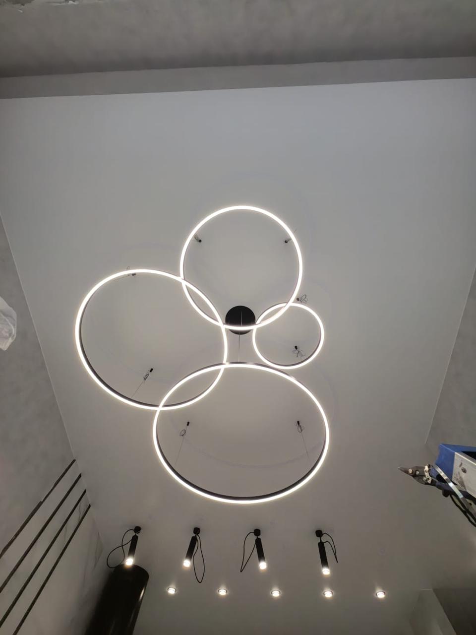 Они отличаются современным видом и зачастую имеют встроенные светодиоды, управление с пульта и через систему умного дома. Это могут быть модели с несколькими светодиодными кольцами, расположенными на разной высоте, модели на невидимых тросиках с двумя и более точками креплений, накладные варианты в форме круга разного диаметра, с шарами белого и прозрачных цветов и др.