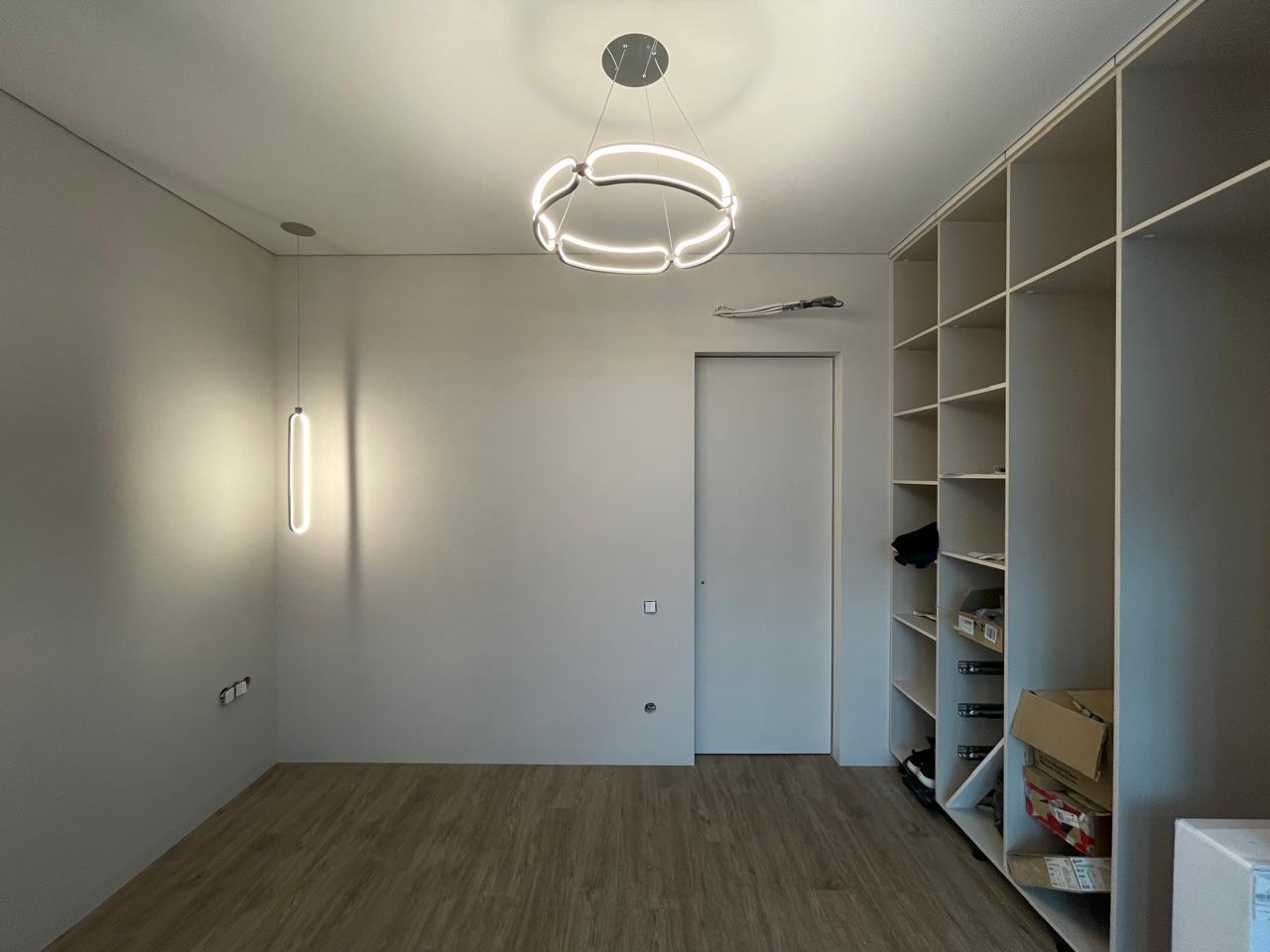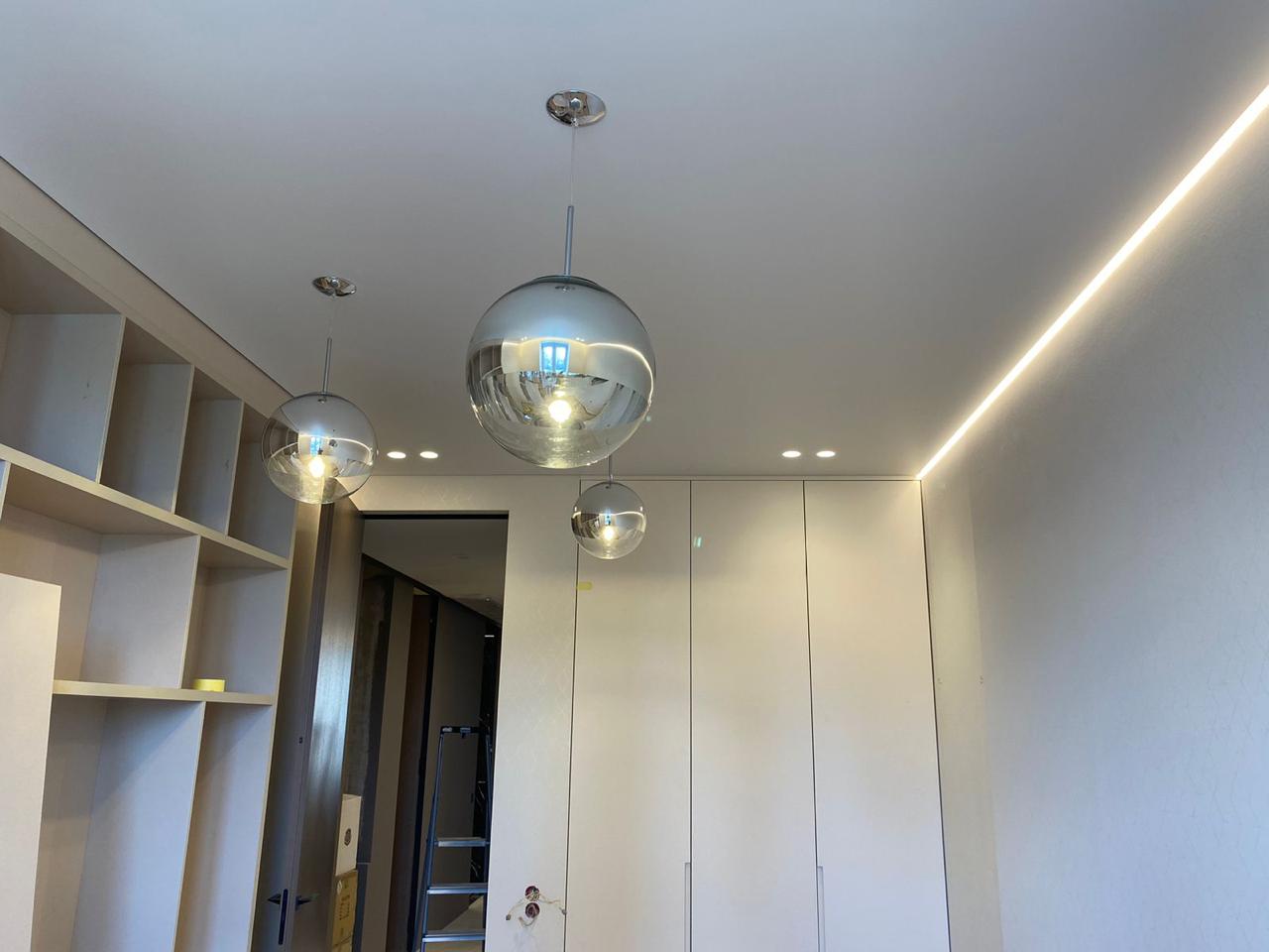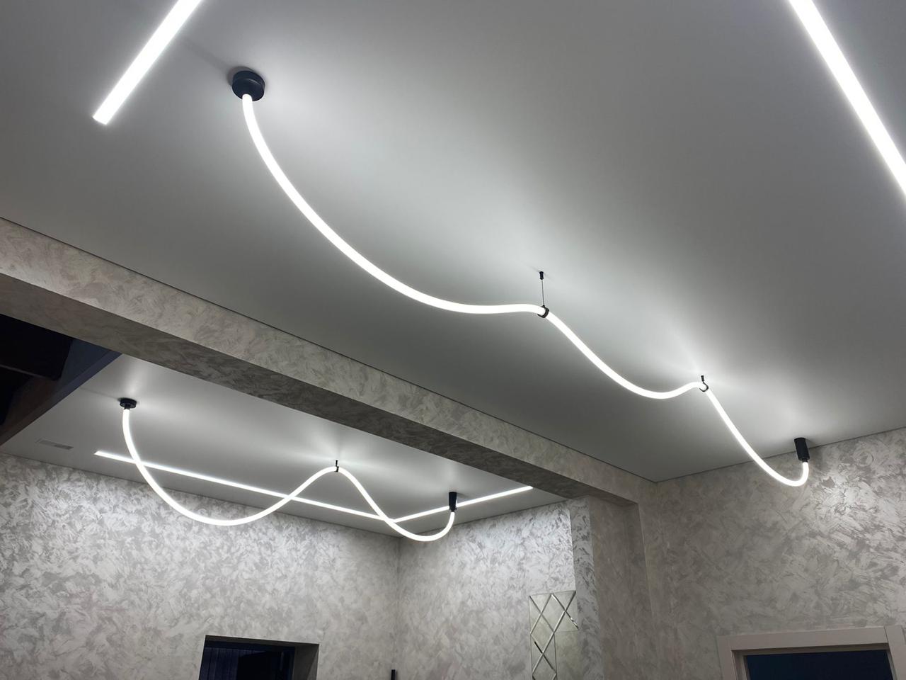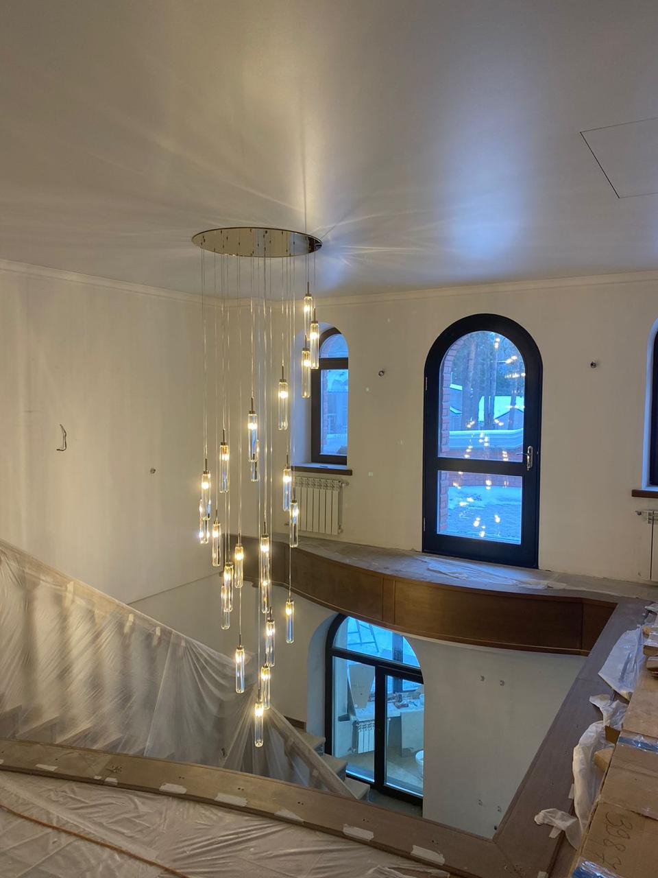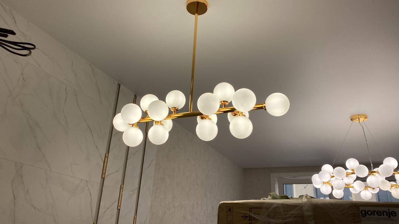 Они отличаются современным видом и зачастую имеют встроенные светодиоды, управление с пульта и через систему умного дома. Это могут быть модели с несколькими светодиодными кольцами, расположенными на разной высоте, модели на невидимых тросиках с двумя и более точками креплений, накладные варианты в форме круга разного диаметра, с шарами белого и прозрачных цветов и др.