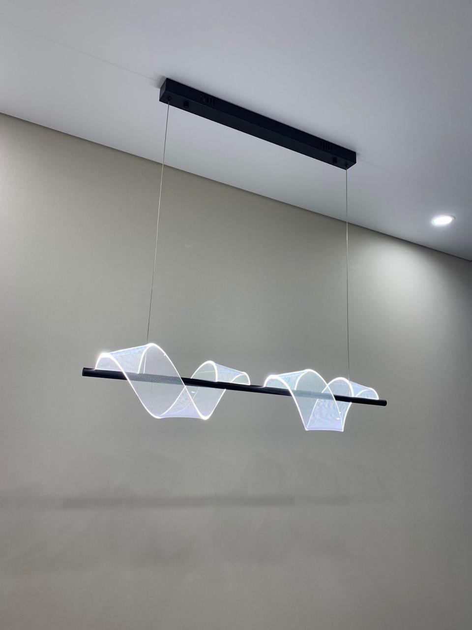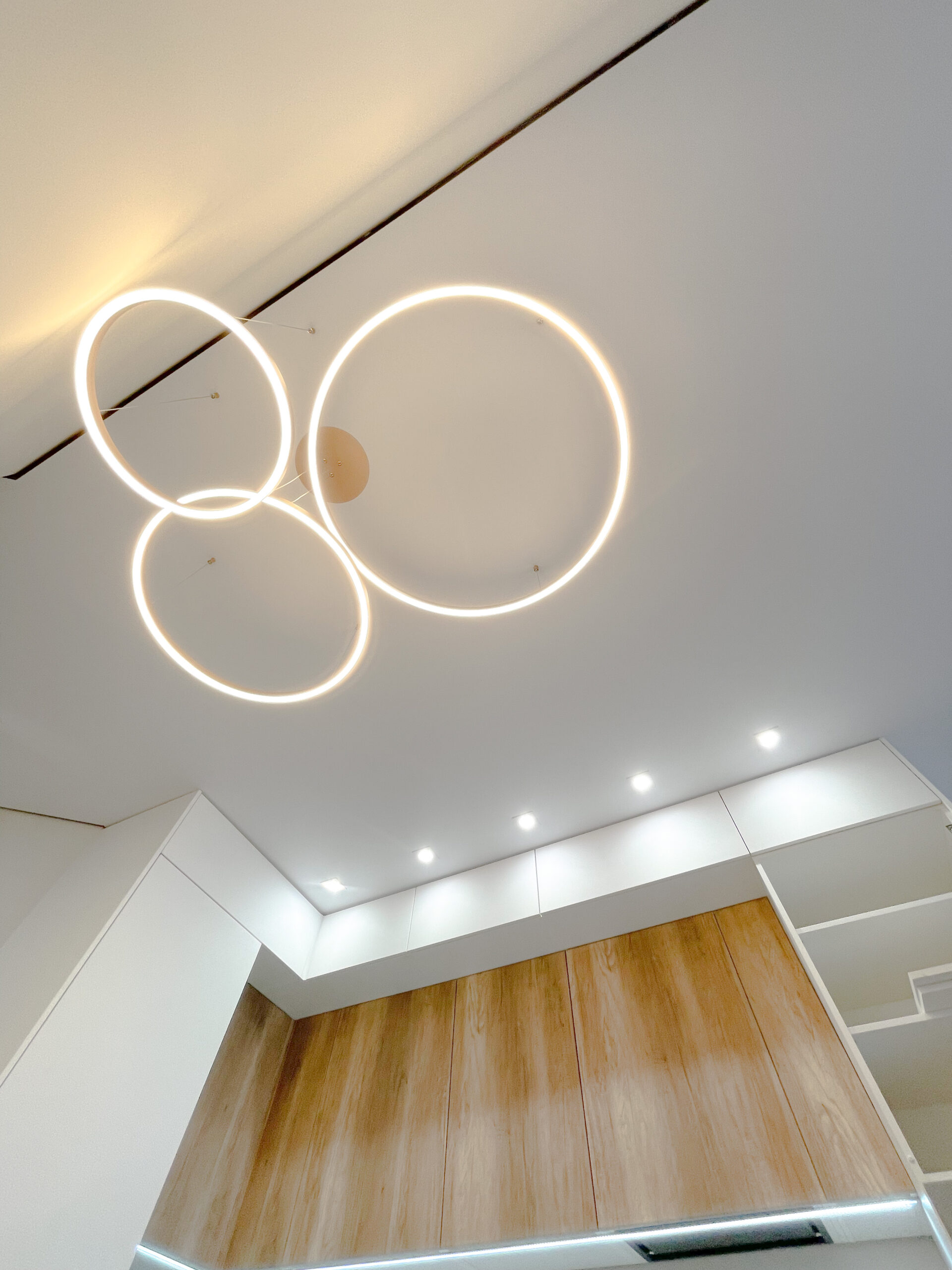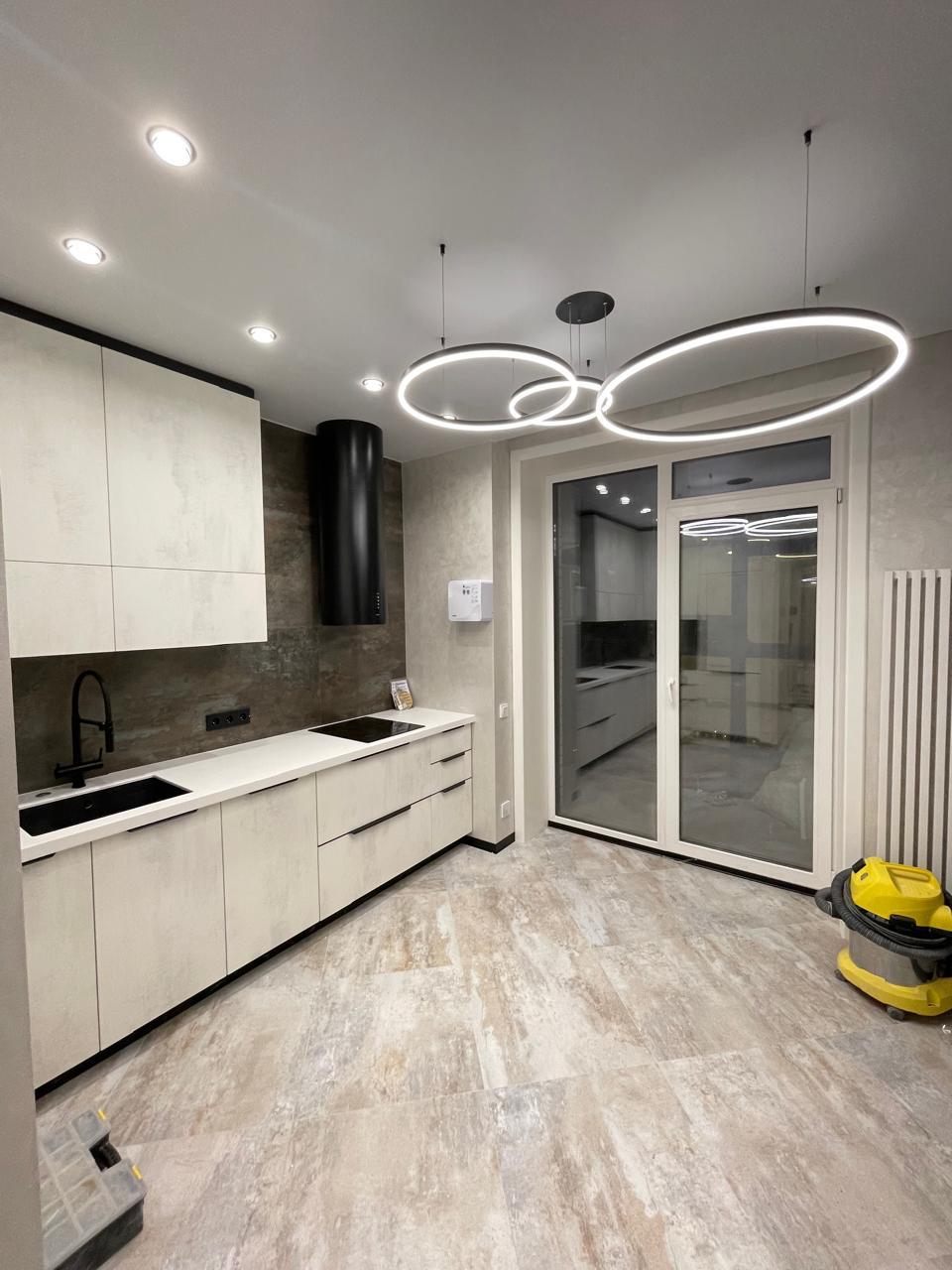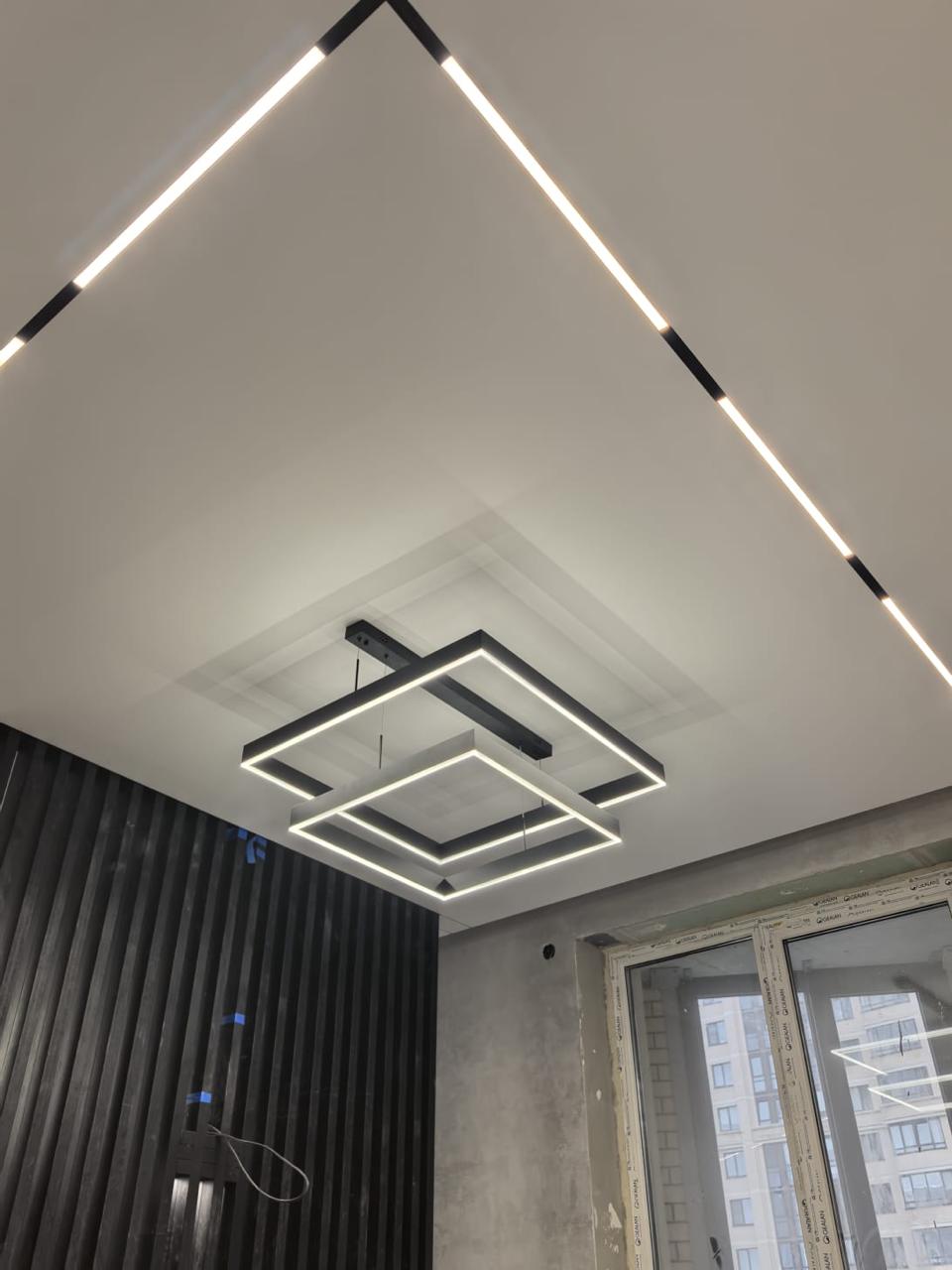 Они отличаются современным видом и зачастую имеют встроенные светодиоды, управление с пульта и через систему умного дома. Это могут быть модели с несколькими светодиодными кольцами, расположенными на разной высоте, модели на невидимых тросиках с двумя и более точками креплений, накладные варианты в форме круга разного диаметра, с шарами белого и прозрачных цветов и др.