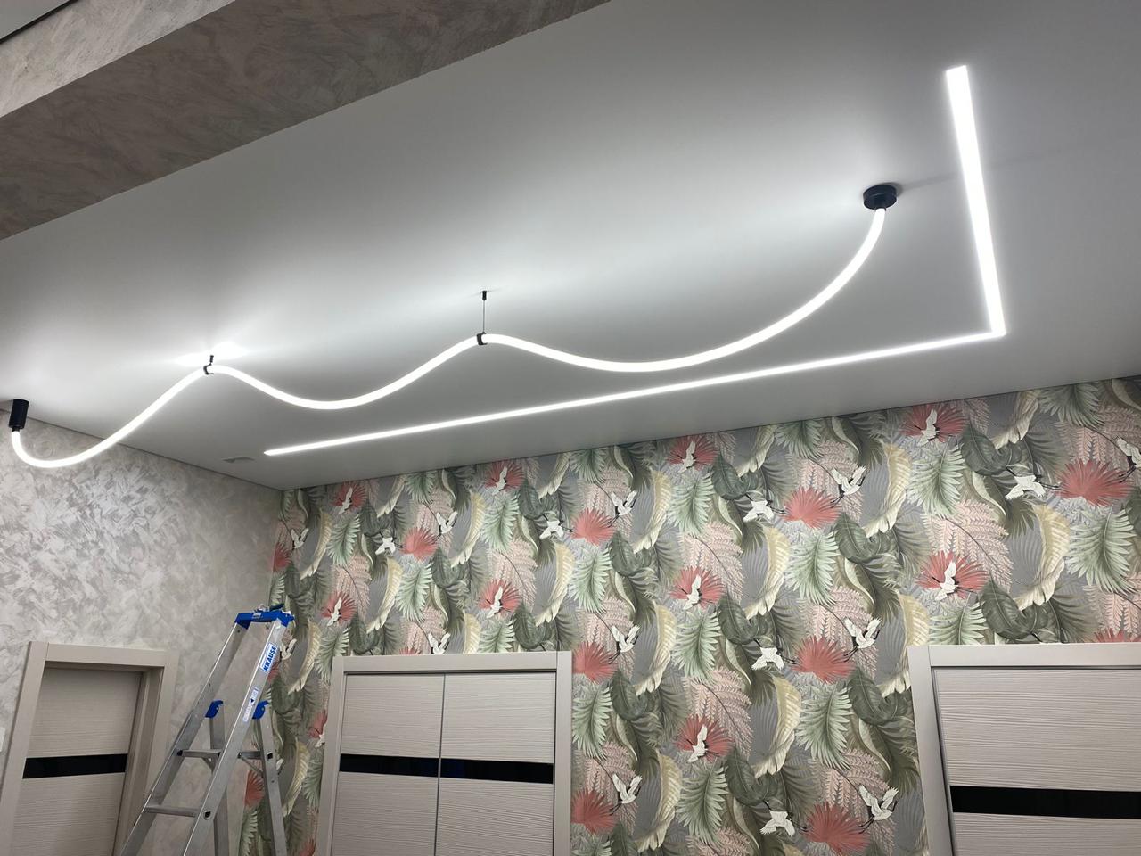 В спальне часто используют два подвесных светильника по краям кровати, для удобства чтения в вечернее время. Плюс основным освещением могут выступать световые линии, или же трековая система.