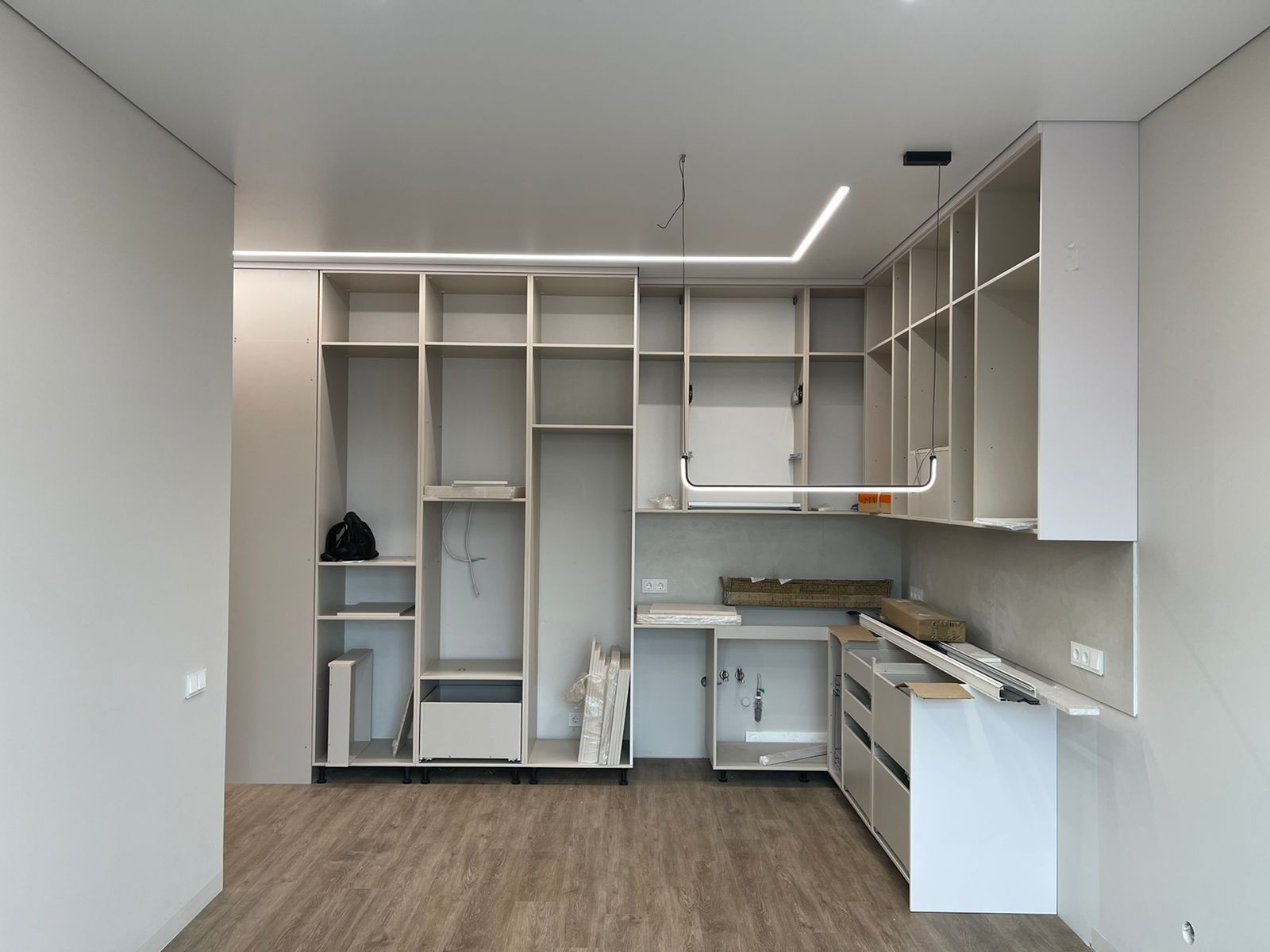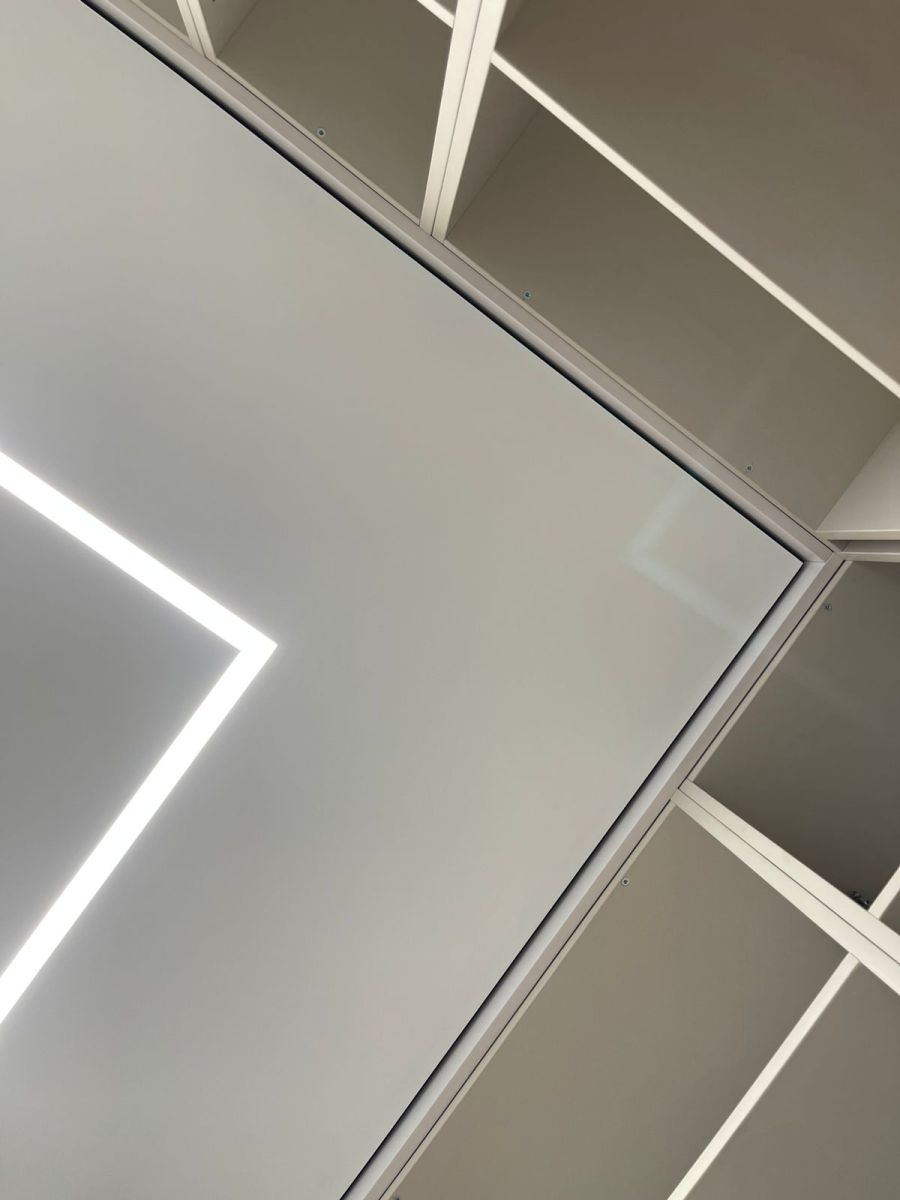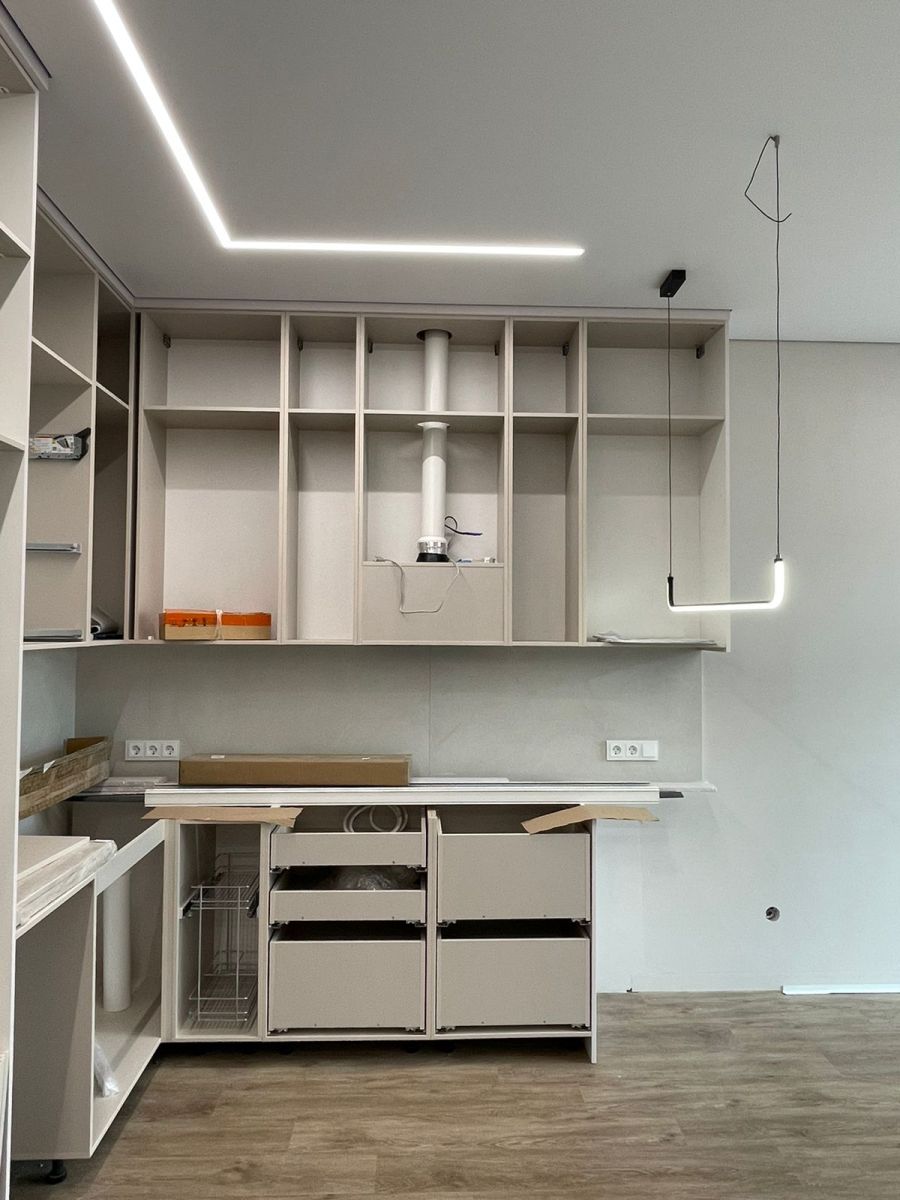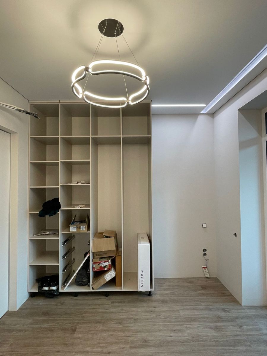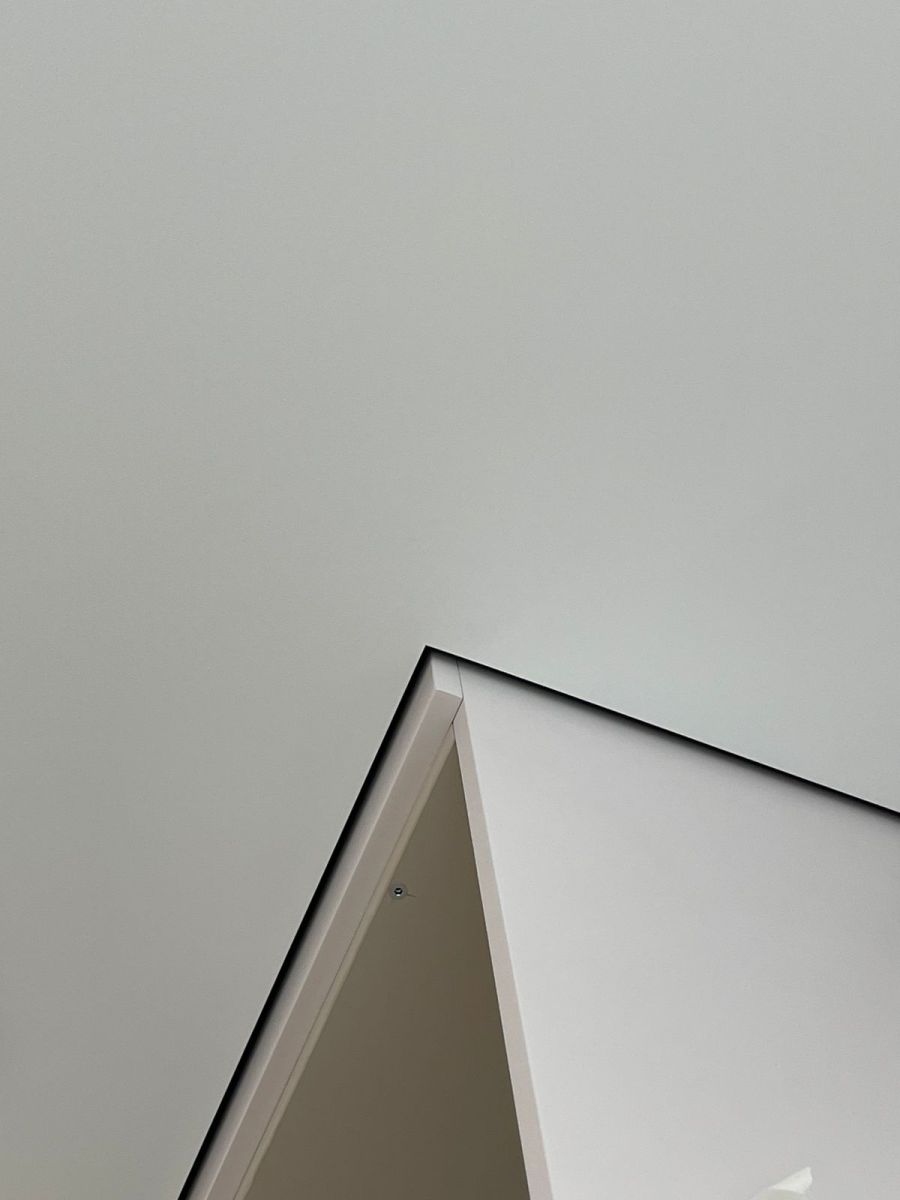 Работы по установке потолка производились после завершения ремонта и сборки мебели. Так нам удалось сохранить теневой зазор по мебели. Это практично и красиво.